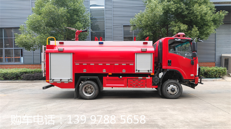 慶鈴700P水罐消防車,水罐容積4.2立方米,四驅(qū)。 主要專用裝置有消防泵、消防車炮。