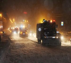 晚上21時,天空飄著大雪,在人民大街與自由大路交匯處8輛由消防車改裝的清雪車格外引人注目,一輛清雪車尤顯特別,這輛車的前身自帶有除雪刷,在積滿厚雪的路面它可以一邊快速將壓實的冰雪清除,一邊可將路面的積雪迅速清掃干凈。這就是由長春市公安消防支隊的運兵車改裝的除雪滾刷車。這輛車集推雪、掃雪、除冰等多種功能于一車,是非常先進的清雪車。