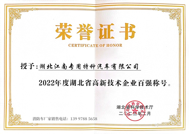 我司獲得由湖北省科學(xué)技術(shù)廳、湖北省財政廳、國家稅務(wù)總局湖北省稅務(wù)局機(jī)關(guān)批準(zhǔn)。由湖北省科學(xué)技術(shù)廳頒發(fā)的“2022年度湖北省高新技術(shù)企業(yè)百強(qiáng)稱號”榮譽(yù)證書。